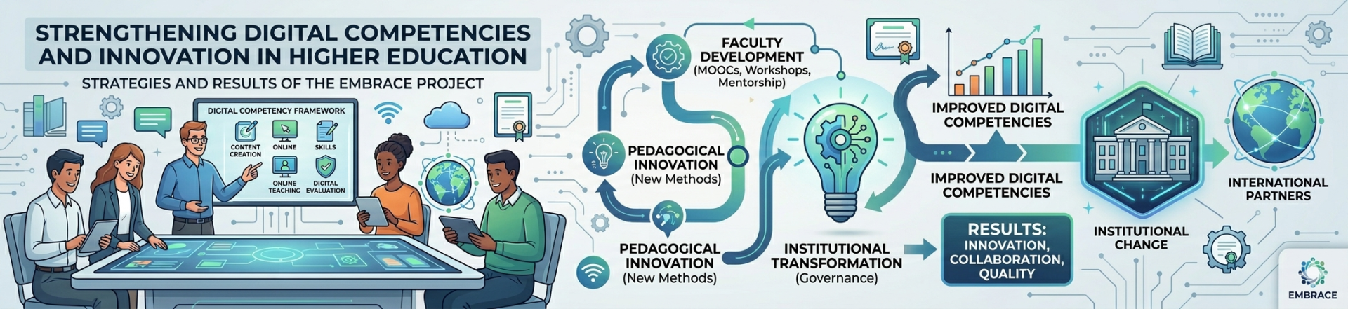 Este informe describe el desarrollo e implementación de estrategias orientadas a fortalecer las competencias digitales y promover la innovación en instituciones de educación superior participantes en el proyecto EMBRACE. Se centra en procesos de formación docente, transformación institucional e integración de tecnologías digitales en la enseñanza y el aprendizaje.